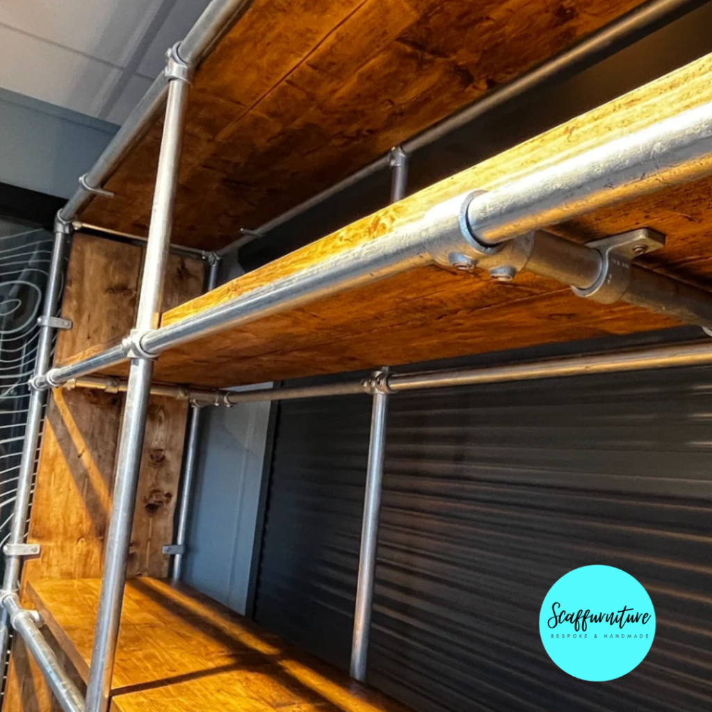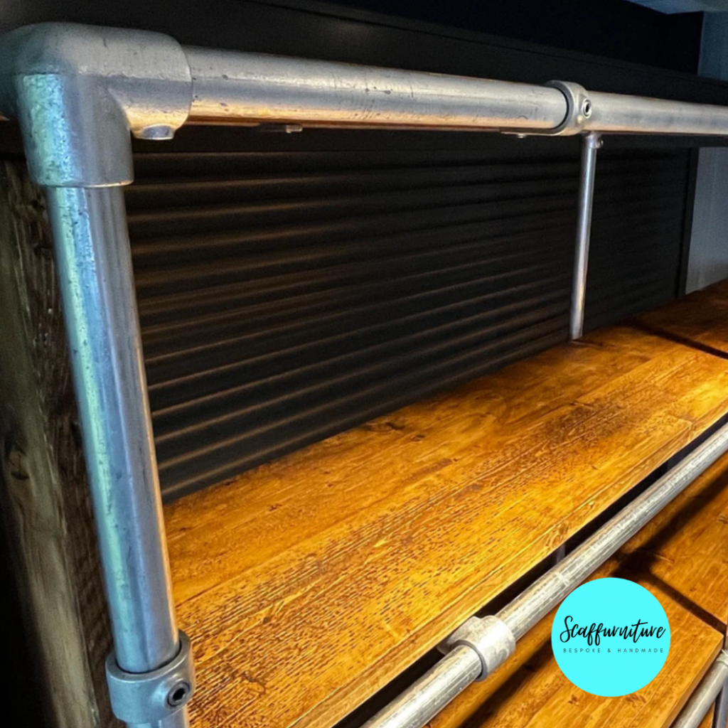 Spec: 2.5m Wide Heavy Duty Display Cabinet. 2m High. 50cm Deep. 3 internal shelves. Top and sides clad in Scaffold Board. Finished in Dark Oak Wax.